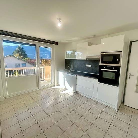 Découvrez en dernier étage ce superbe appartement T2 de 34,95 m2 entièrement refait à neuf, situé au 1 rue du Salève à Ambilly. Il se compose d'une pièce principale lumineuse de 16,5 m2 avec cuisine ouverte, d'une chambre confortable, d'un balcon, une salle de bains d'un séchoir et d'une cave en sous-sol. Vous profiterez d'une vue imprenable sur le Salève et d'une luminosité exceptionnelle. L'appartement est à usage exclusif d'habitation, non meublé, et bénéficie d'un environnement calme, à moins de 2 minutes à pied du tramway. Attention l'i...