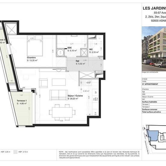 Appartement de 54 m² à louer sur Asnières-sur-Seine Immeuble neuf de standing (Septembre 2024) R + 5 : idéalement au 55 avenue de la Marne à Asnières, situé à 3 min de la gare d'Asnières, à 7 min de St-Lazare et à 6 min de la Défense, proche de tous commerces et écoles. Appartement F2 neuf de 54 m², 2ème étage, jamais habité, emménagement immédiat. Entrée avec placard, Séjour cuisine, 1 chambre avec placard, salle d'eau avec sèche serviette, wc séparés avec emplacement pour le lave-linge, 1 terrasse pour le séjour, 1 terrasse pour la chambre...