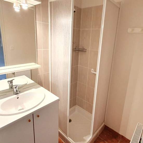 BARAQUEVILLE : Résidence au coeur des commerces, belles prestations, exposition Sud, lumineux et agréable T 2 comprenant hall d'entrée, séjour avec accès sur terrasse/loggia de 6,90 m², cuisine américaine aménagée (placards hauts et bas, bar, réfrigérateur-congélateur, four, plaque induction, hotte aspirante), salle d'eau aménagée, 1 chambre avec placard, Chauffage collectif gaz Annexe : 1 cave (4,70 m²).
