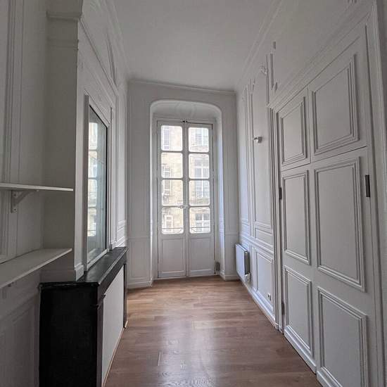 Bordeaux St Pierre. Grand appartement type 2 au 2ème étage avec ascenseur. Séjour, chambre, cuisine aménagée et équipée, salle de bain et w. c séparés. Trés belles prestations : Parquet ancien, moulures et cheminée, balcon. Libre de suite Tél : .