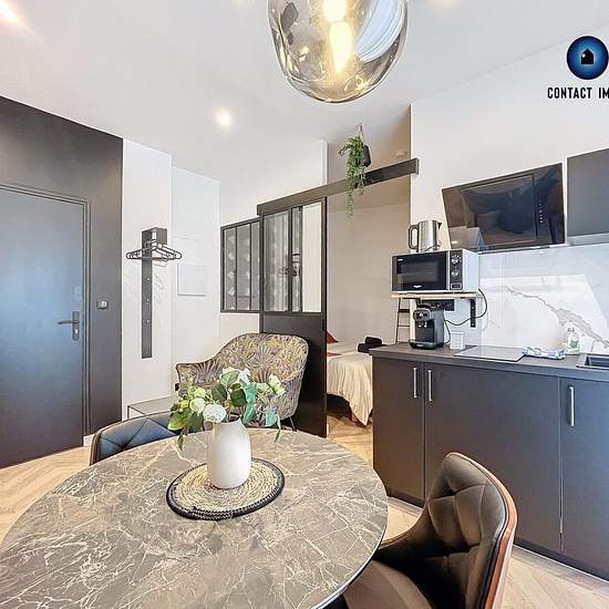 Situé au 1er étage d'un immeuble en brasier exceptionnel et sécurisé, ce charmant studio meublé, soigneusement rénové en 2023, allie élégance et modernité. Cet appartement offre un cadre de vie confortable et sophistiqué, parfait pour les citadins à la recherche de praticité et de style. Il comprend une cuisine aménagée et équipée, une salle d'eau moderne, un coin repas convivial et pratique, un espace salon accueillant et confortable pour se détendre, ainsi qu'une chambre séparée avec un lit confortable et des rangements intégrés pour optim...