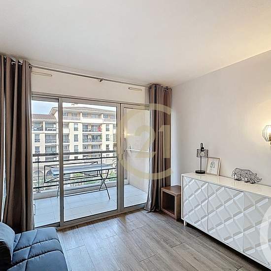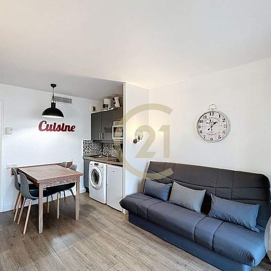 Votre agence CENTURY 21 Immobilier Conseil à Cannes La Bocca vous propose à la location ce charmant deux pièces meublé dans un style moderne, situé au sein de la résidence Cannes Beach, en plein cœur du centre-ville de Cannes La Bocca. L'appartement se compose d'une entrée avec deux placards, d'un coin nuit, d'une salle d'eau avec WC, et d'une cuisine aménagée et équipée avec lave-linge ouverte sur le séjour donnant accès à un balcon. Le logement, climatisé, bénéficie d'un confort optimal avec le chauffage, l'eau chaude et l'eau froide inclu...