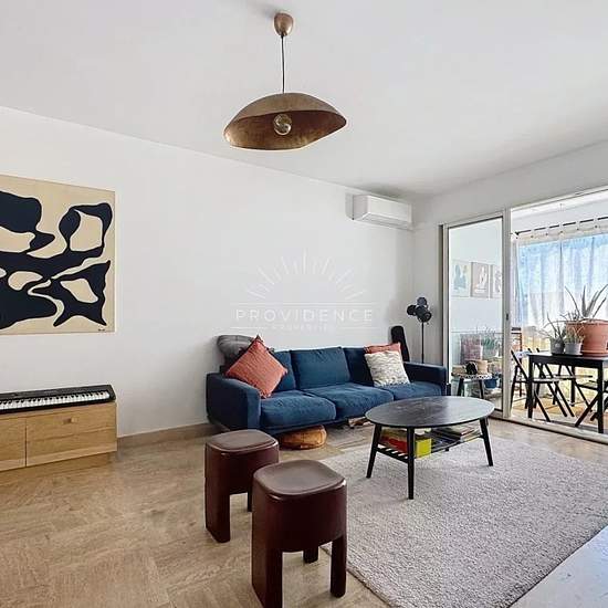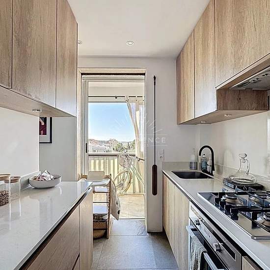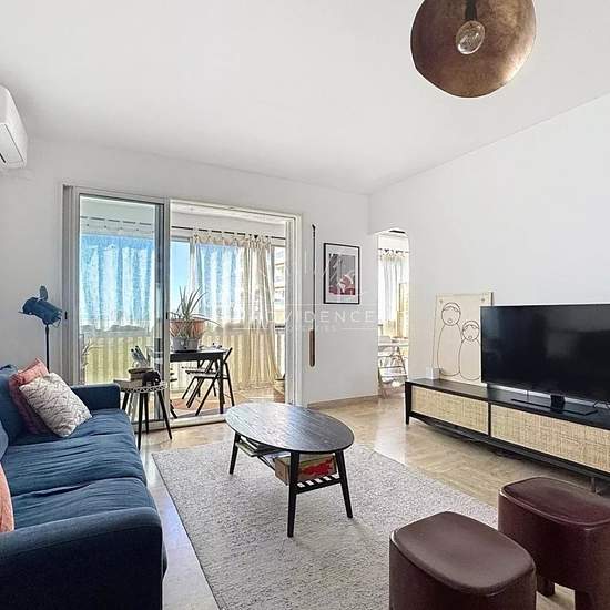 Situé au 3ème étage avec ascenseur, cet appartement de 59 m² dispose d'une loggia de 10 m² avec aperçu mer. Entièrement rénové, il a été conçu sur mesure avec des aménagements intégrés de qualité. Il se compose d'un hall d'entrée, d'une cuisine contemporaine entièrement équipée, d'un séjour spacieux avec coin bureau, d'une chambre avec rangements intégrés, d'une salle de douche rénovée et de la loggia de 10 m². Orienté plein sud, il bénéficie d'une belle luminosité et d'une vue dégagée. Entièrement climatisé, y compris sur la loggia, il offr...