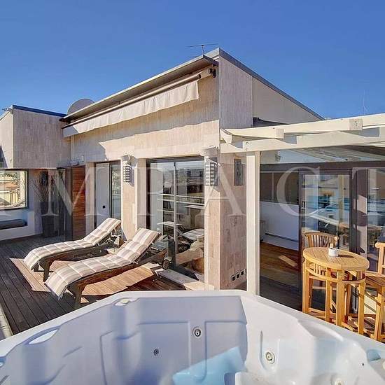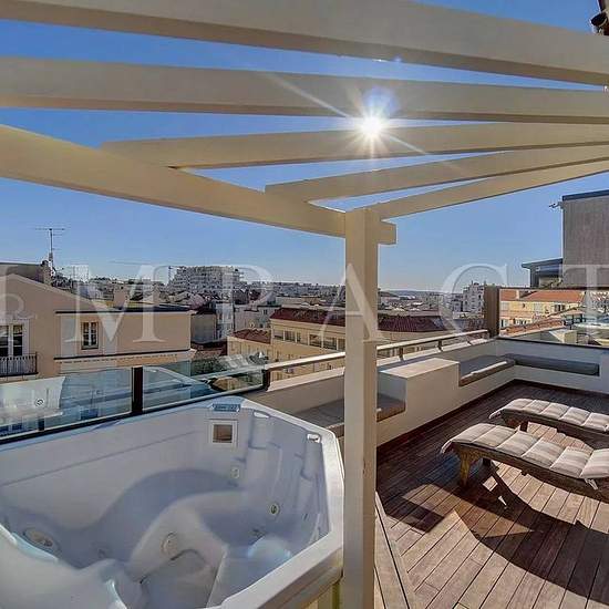 Gray d’Albion, appartement moderne de 80m2, terrasse 20 m² avec jacuzzi et vue sur la ville de Cannes. Descriptif : Hall d'entrée, toilettes invités Salon/salle à manger équipé pour 4 personnes avec canapé et télévision Cuisine ouverte sur le salon entièrement équipée : plaque induction, lave-vaisselle, micro-ondes, four, réfrigérateur/congélateur, machine Nespresso. Chambre maître: Lit double 160cm x 190cm, placard et télévision. Salle de douche en suite avec douche, toilette et double vasque. Terrasse avec vue dégagée sur la ville et jacuz...