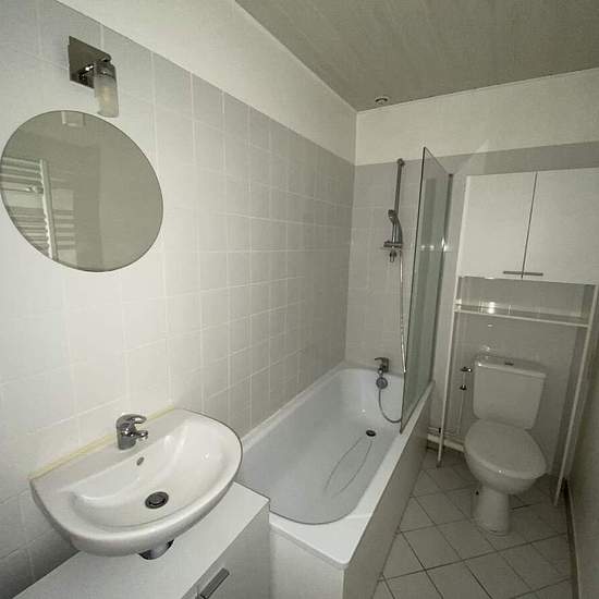 Au 2ème étage d'un immeuble calme et proche des commerces, appartement F2 comprenant un couloir, une cuisine aménagée (et équipée d'une hotte), une salle à manger, une chambre, une salle de bains avec wc. Chauffage par convecteurs électriques (panneaux rayonnants). Parkings publics à proximité
