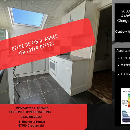 Appartement F2 de 54,41m2 (Loi Boutin), au 3ème étage d'un immeuble comprenant 3 lots d'habitation et un commerce: une entrée, une cuisine équipée, une salle de bains avec baignoire et colonne de douche et ballon d'eau chaude électrique, un salon de 16.03m2, une chambre de 14.78m2 et un wc Chauffage électrique, menuiseries double vitrage pvc. Loyer: 418EUR/mois Charges (provision): 30EUR/mois (eau froide, électricité et entretien des communs, ordures ménagères) Dépôt de garantie: 418EUR Honoraires à la charge du locataire: 380.87EUR dont 163...