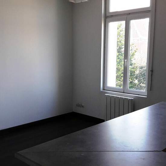 Appartement 1er étage d'une maison bourgeoise hall, séjour / cuisine équipée, salle de douches, wc, 1 grande chambre, parking privé, double vitrage, volets, chauffage electrique a fluide individuel a 15 min de valenciennes agence de bruay : .