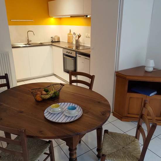 Dans résidence calme et récente rue de Bourgogne charmant T2 meublé de 46 m² en rez-de-chaussée donnant sur une terrasse de 13m² sans vis à vis. Point d’eau sur la terrasse. Appartement composé d’une entrée avec placard, d’un séjour/cuisine de 26.38m². Coin cuisine équipé avec vaisselles, ustensiles de cuisine, plaque à induction, réfrigérateur, four, micro-ondes, lave-vaisselle et lave-linge, d’une table pliante (jusqu’à 6 convives). Le séjour est équipé d’un canapé en cuir, d’un fauteuil, d’un petit bureau. La chambre de 12.23m² avec parqu...