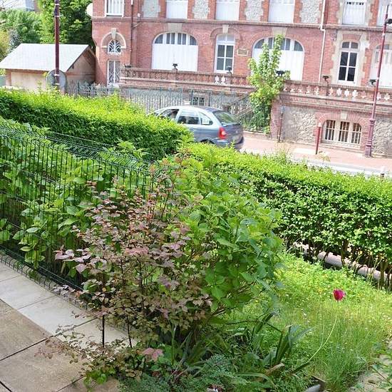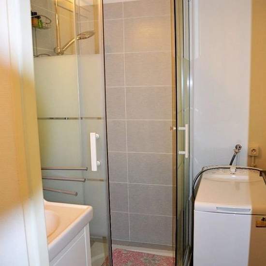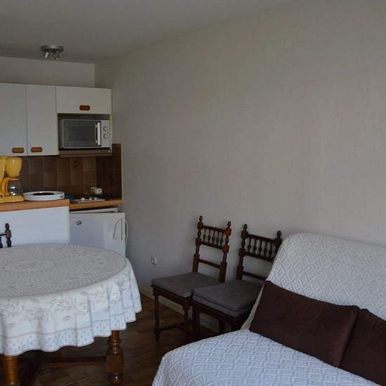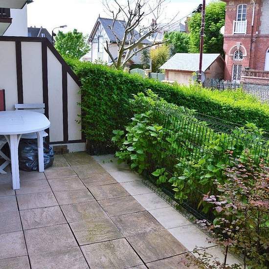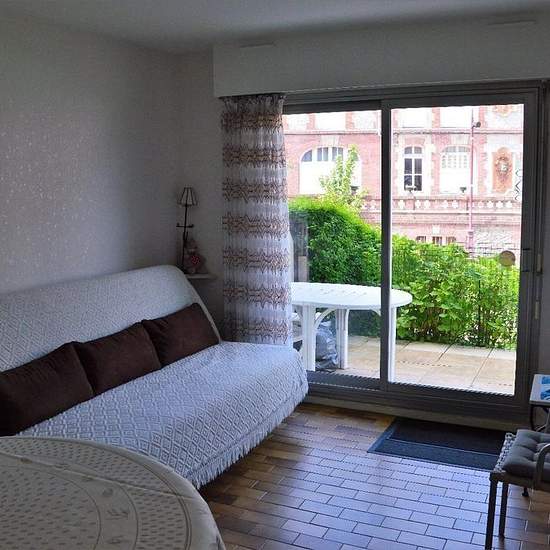 Appartement 2 pièces en centre ville de Houlgate et en accès direct plage en rez de jardin comprenant une entrée, une salle de douches et wc, un salon séjour avec une kitchenette, une chambre avec deux lits simples. Idéal pour 2 à 4 personnes. Place de parking en sous sol.