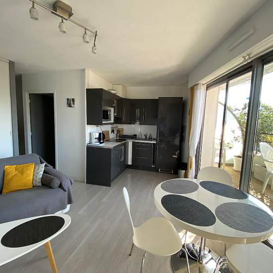 Appartement meublé spacieux et lumineux au dernier étage avec ascenseur. Il se compose d'une entrée, un séjour avec coin cuisine, une chambre, une salle de bains et WC séparé. Les plus : spacieuse terrasse et une place de stationnement. Les charges comprennent l'eau et l'entretien des communs. Libre début janvier.