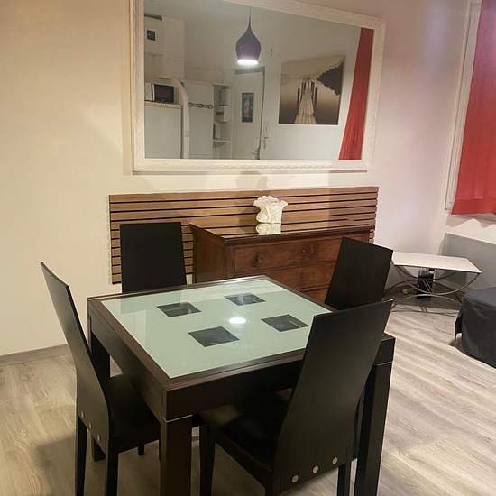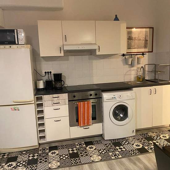 Appartement de 32m² comprenant une cuisine entièrement équipée avec lave-linge, plaques électriques, four et réfrigérateur. La pièce principale est aménagée avec un canapé-lit, une table avec chaises et une télévision. La chambre dispose d'un lit double et d'une armoire. Une salle d'eau complète ce bien. Situé au troisième étage d'un immeuble de 4 niveaux, sans ascenseur.