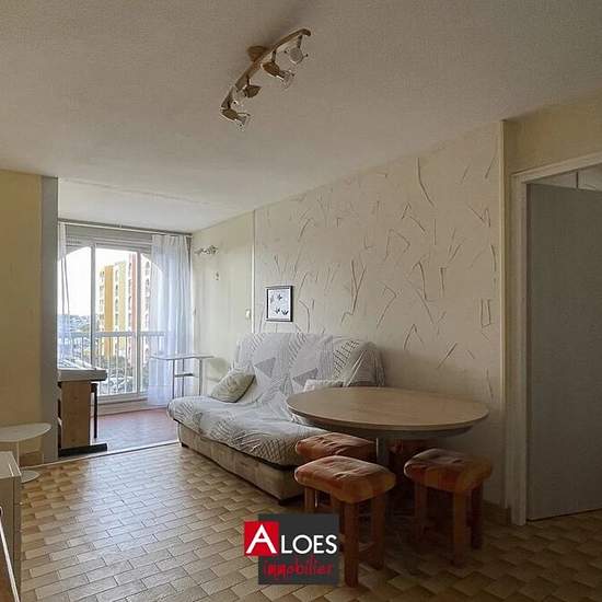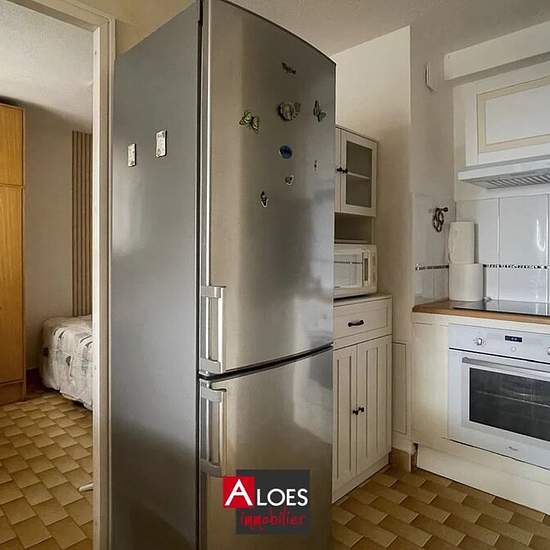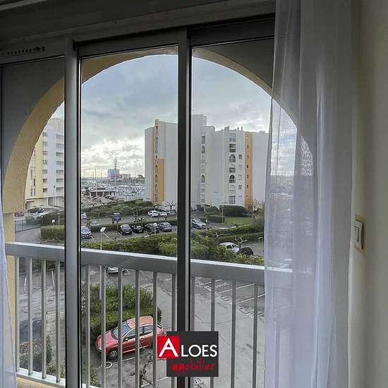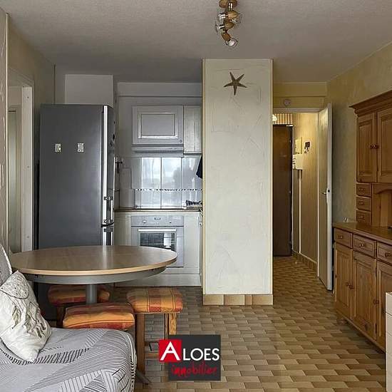 Carnon Plage — furnished one-bedroom (T2) apartment of 33.87 m² for rent on the 3rd floor with elevator. Furnished in a traditional style, with no outdoor space. It comprises an entrance hall, a living area with a kitchenette, and a bedroom. Heating is by electric radiators. A private parking space completes the property.