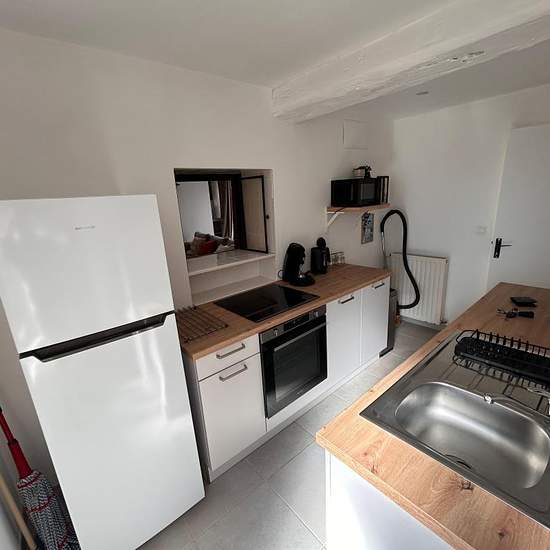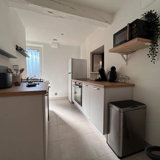 Mer, hyper centre, bel appartement meublé en rez de chaussée: cuisine aménagée et équipée, séjour-salle à manger, chambre, salle d'eau. Chauffage et wifi compris dans les charges. Disponible de suite