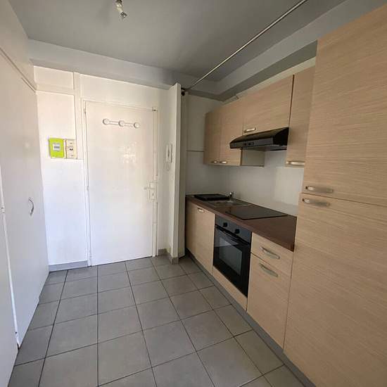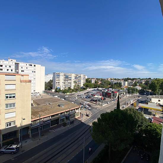 10 minutes by tram from the Comédie, a 38 m² apartment on the 6th floor with elevator comprising an entrance with fitted kitchen (upper and lower cupboards, oven, hob, extractor hood, integrated fridge-freezer), living room, bedroom and shower room with WC. 5 m² balcony. A stone's throw from shops and Tram Line 2. Available immediately. Rent €602 + €84 in charges including heating and cold water.