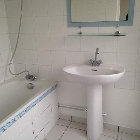 Rue des Grands Champs : Singulier F2 de 58 m2 avec sa petite terrasse. Entrée dans une grand piéce de vie traversante de 45m2 avec sa cuisine ouverte, chambre, terrasse , salle d'eau et WC. Situé dans une cour. Chauffage individuel électrique.