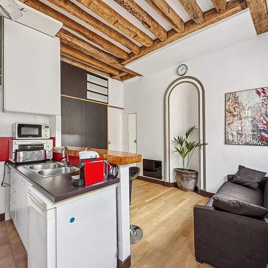 Attention : Bail Civil Uniquement Vivez en plein cœur du très recherché quartier Montorgueil / Saint-Sauveur, dans un studio bis, comme un F2 meublé de 26,15 m² Carrez + 4 m² en mezzanine. Situé au 3e étage sans ascenseur, cet appartement atypique allie charme historique et fonctionnalité contemporaine — poutres anciennes, hauteur sous plafond généreuse et ambiance claire & paisible sur cour. Entrez dans un espace de vie lumineux et optimisé : * Un séjour avec cuisine américaine ouverte, parfait pour cuisiner tout en restant connecté à votre...