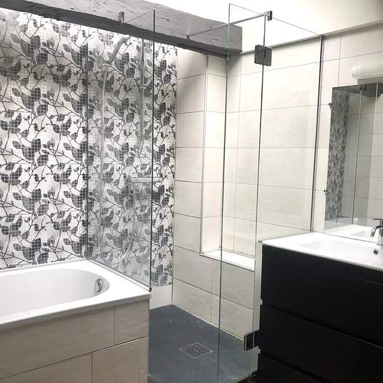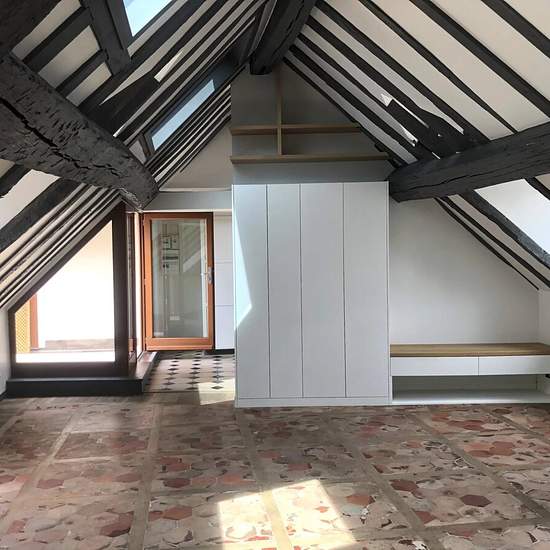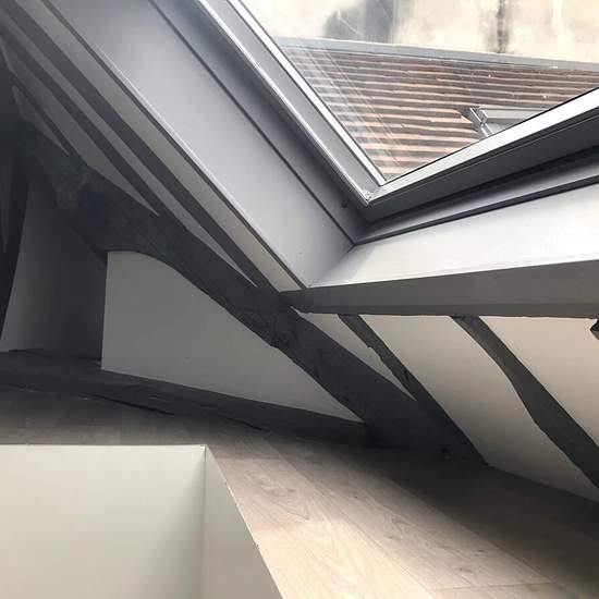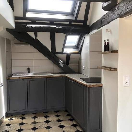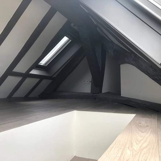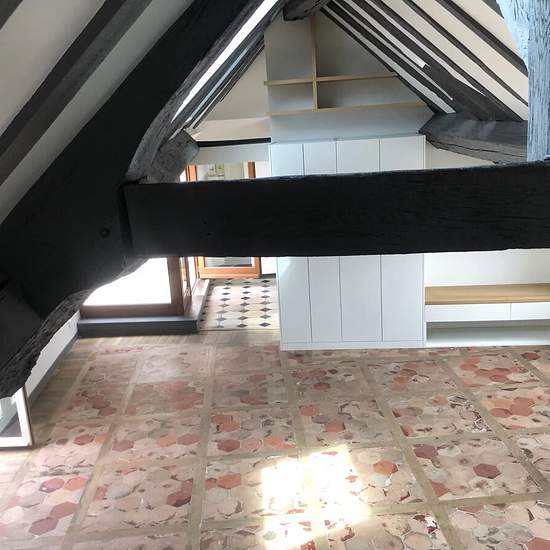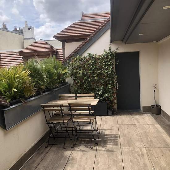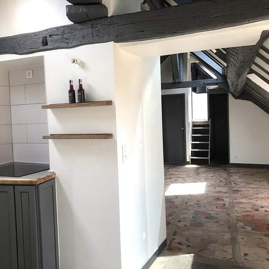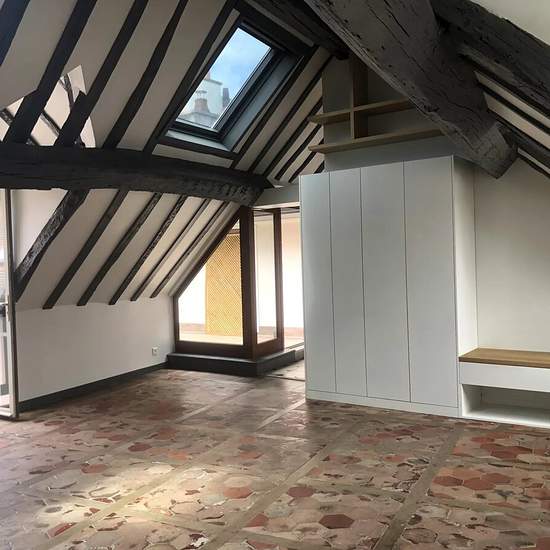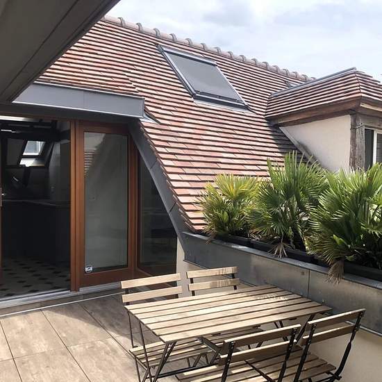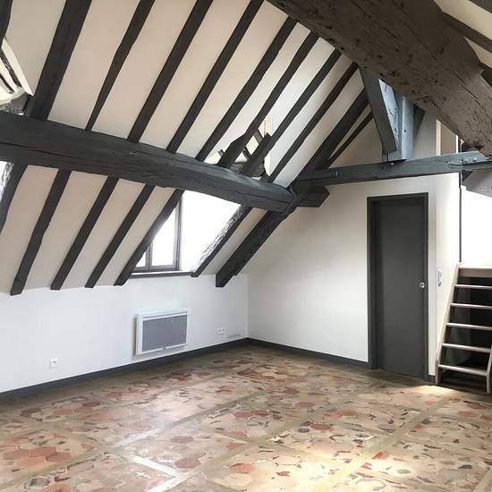 BAIL CIVIL uniquement (résidence secondaire). Au 4ème et dernier étage sans ascenseur d'un bel immeuble 18ème avec digicode, appartement d'un charme fou (44,65m² Carrez, 68,88 m² au sol) bénéficiant de 4 expositions et ouvrant sur une terrasse plein ciel de 12m²: un bien rare! Il comprend un salon traversant, une cuisine aménagée, une chambre avec placard, une mezzanine bureau ou chambre d'appoint éclairée par 2 vélux, une salle de bain avec toilettes et des toilettes séparées. Carrelage et tomettes anciennes. Charpente bois dans le salon: 4...