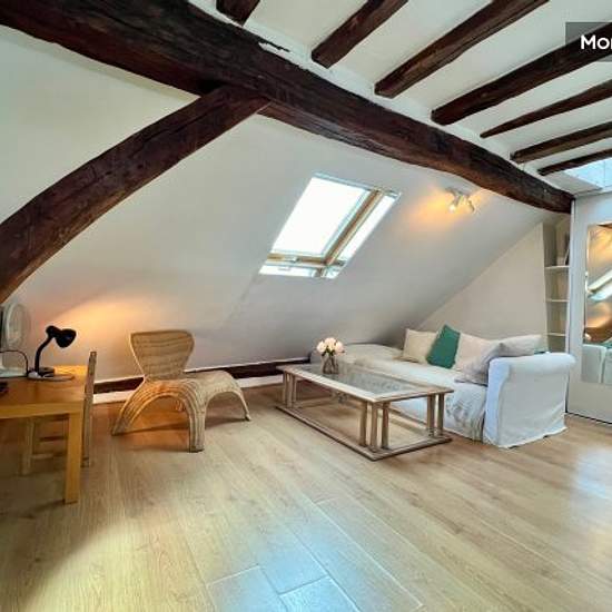 Atypical and very charming loft studio of approx. 23 m Carrez (and 55 m floor area) with a bedroom area is located on rue de Montmorency in a quiet street in the Marais. It features a bright 2-exposure lounge, an open-plan kitchen, a bedroom area (with shower) and a small bathroom (toilet + sink). It has all the quality features needed to accommodate a maximum of 2 people on a leisure or business trip. This light-filled flat has low ceilings (1.95 metres at the highest point in the room) and is on the 6th and top floor with a lift (only up t...