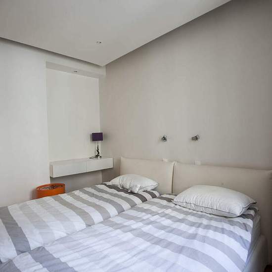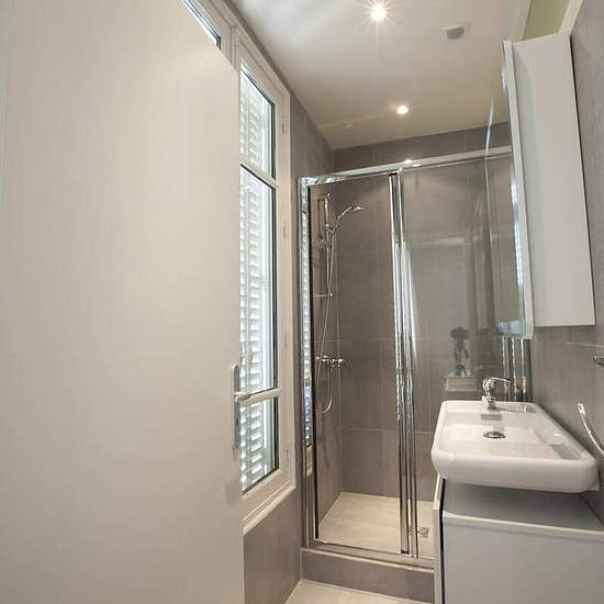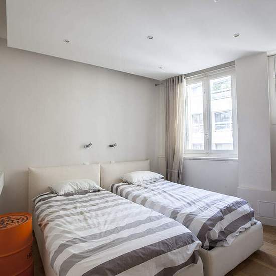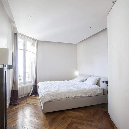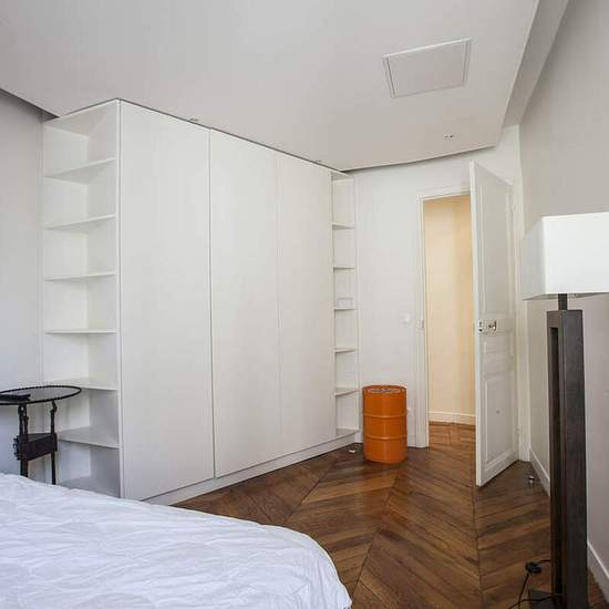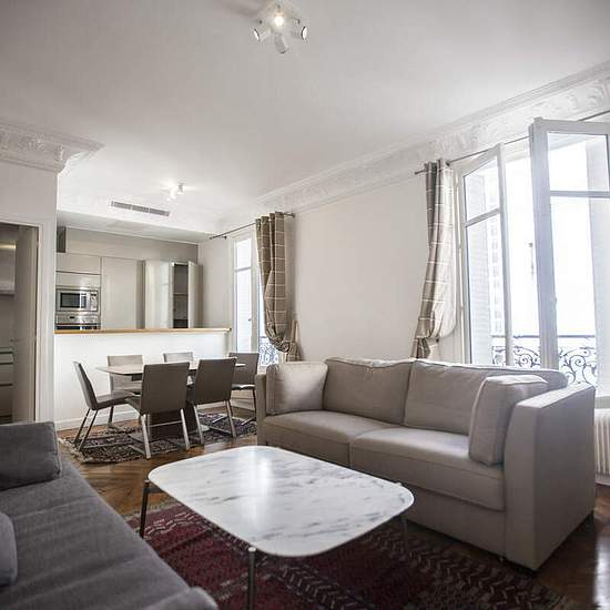 Spacious 2-bedroom flat at Rue Saint-Didier in the 16th arrondissement of Paris. It is a worthy option for a family apartment in a respectable area of the French capital. Large windows provide natural light; 80 square meters of floor space; attractive functional furnishings; 4th French floor of a building with a lift. Number of tenants - up to four persons; minimum rental period - six months. Layout: a living room with sofas, TV, a coffee table, a dining table for six persons; an open-plan kitchen with a breakfast counter; two bedrooms wi...