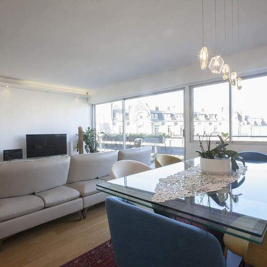 Large and very light 2-bedroom apartment for rent at Avenue Victor Hugo in the 16th district of Paris. Wonderful residence for a family with a child in a prestigious neighborhood of the French capital, providing comfortable living in all its manifestations. Chic interior design; superb furnishing; quality modern home appliances; 108 square meters; large panoramic windows; 7th floor of a building with elevator. Accommodates four people; minimum rental period is one month. Layout: living room (a big comfortable sofa, a dining table, TV, an ...