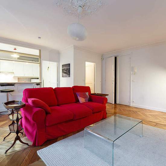Light furnished 2-bedroom apartment for long-term rent in the historic center of Paris - its 5th arrondissement. Comfortable flat with big windows for a family with a child in a wonderful area of the city with a special flair. Surface - 72 square meters; parquet flooring; quality furniture and household appliances; 4th floor of a residential building with concierge and lift. Minimum rental period - 10 months. Layout: living room (a fireplace, a sofa, a coffee table, TV, shelves); fully equipped kitchen with dining space; adult bedroom (a ...