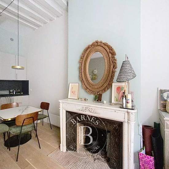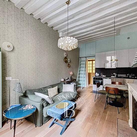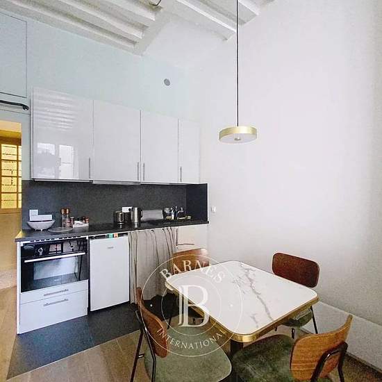 Monnaie - Rue Dauphine - A furnished rental apartment of 36.72 m² of living space located on the first floor accessed by stairs of a building from the first half of the 19th century, benefiting from old-world charm: wooden floors, beams, fireplace, very high ceilings and a pleasant open view over the street. The property comprises an entrance, a living/dining room with an open fitted and equipped kitchen, a courtyard-facing bedroom, and a shower room with toilet. Plenty of storage. Individual electric heating and hot water. Available immedia...