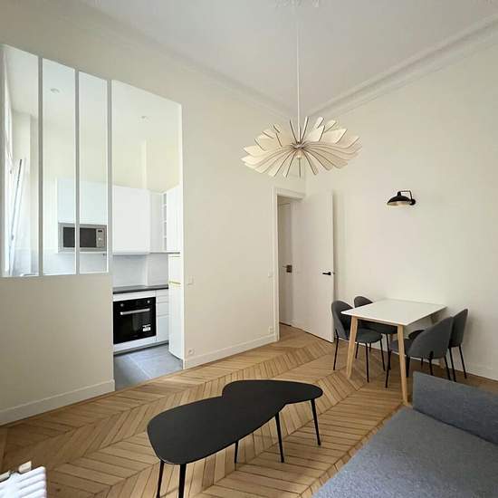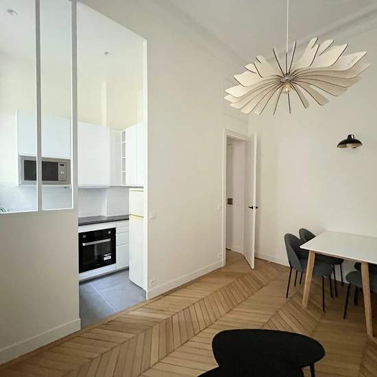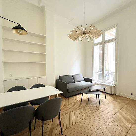 Beautiful furnished 2-room apartment of 37.06 m² floor area and 36.76 m² Carrez area, completely renovated with quality materials. It is located on the 2nd floor of a building with a concierge and elevator, quiet at the rear overlooking the courtyard. The apartment comprises an entrance, a living room with a custom-built bookcase, a fully equipped kitchen (oven, microwave, hob, fridge-freezer and integrated dishwasher), a guest toilet, a bedroom with a closet and a shower room. Rent €1,556 + €220 flat-rate charges, for a total of €1,756 per ...