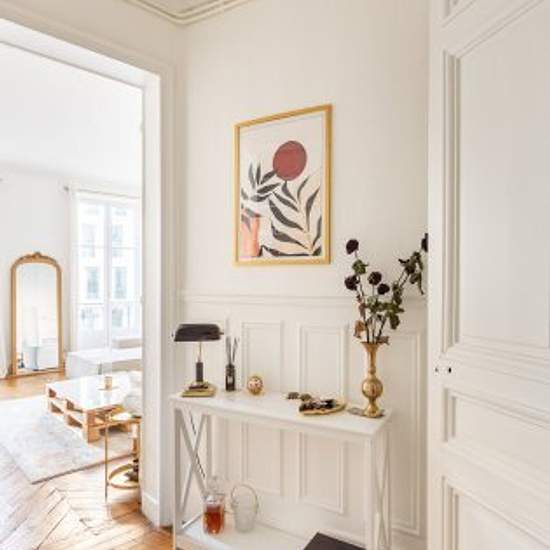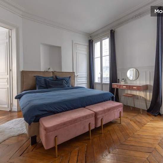 Take advantage of our large, typically Parisian flat (mouldings, fireplace, original parquet flooring) with high ceilings (4.5 m throughout). Each room (bedroom, study, living room, kitchen, bathroom) has a balcony and a 2-metre-high double window. Seven double windows in all. Exceptional light. Ideal location (just opposite the Cadet metro station in the 9th arrondissement, rue Le Fayette). We live here most of the year, so the flat is perfectly equipped and decorated (including exceptional bedding with king-size bed, home cinema, Devialet ...