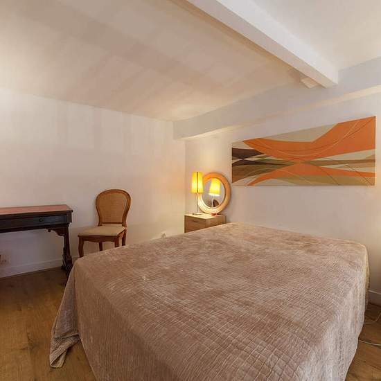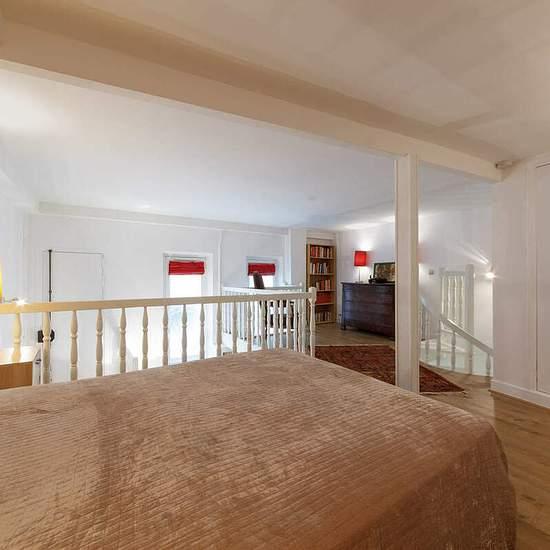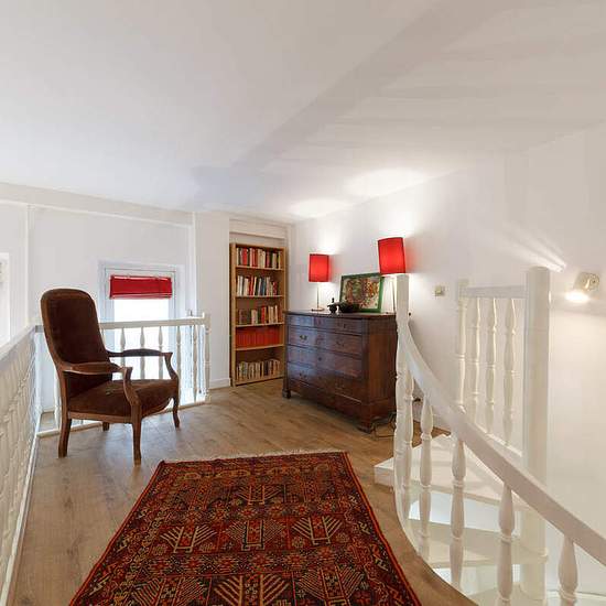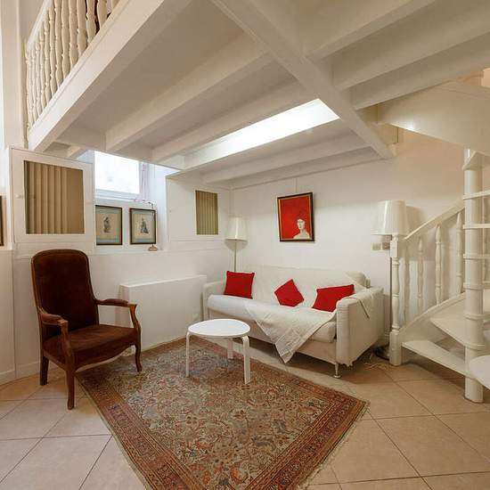 Original, stylish and cozy duplex apartment for rent in Paris on Rue Boissière in the 16th arrondissement. The duplex consists of two rooms (living room and bedroom), features a bright interior and beautiful, comfortable furnishings. Capacity: up to four people; apartment area: 45 square meters. The living room on the lower level offers a sofa, a coffee table, a TV, and a tiled floor. The bedroom on the upper level is furnished with a double bed, a chest of drawers, a bookcase, an armchair, a wardrobe and bedside tables. There is an equipp...