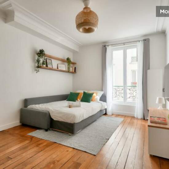 Located in the heart of the 17th arrondissement, in the famous Batignolles district, this flat, completely renovated in 2023, will be perfect for your stay in Paris. It is situated on the 2nd floor (no lift) of a secure residence. This very quiet flat is ideal for a business trip. It is also perfect for 2 people and can accommodate 2 additional guests if needed. This charming 40m² 2-room apartment is composed as follows: - A bedroom with a king-size bed (160x200) with plenty of storage space and a teleworking area. - A comfortable lounge w...