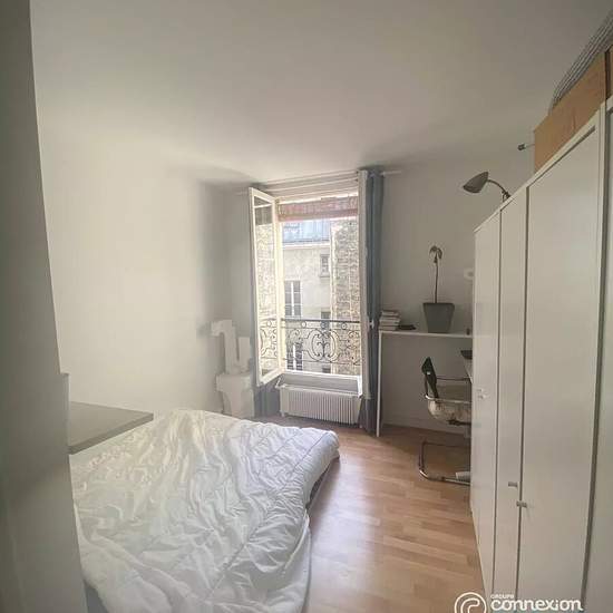 Jules Joffrin Square. On the 5th floor with elevator in a stone-built building. Spacious two-room apartment offering: entrance, living room, bedroom, separate kitchen, bathroom with toilet. Parquet floors. Central heating and hot water. Bright and quiet. Facing due west.