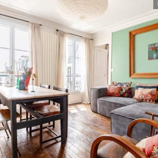 Appartement lumineux et calme de 50m², style atelier d'artiste au 5e étage sans vis-à-vis, orienté plein sud sur un paisible jardin potager de quartier et récemment rénové. On s'y sent tout de suite comme à la maison ! Bibliothèque, chaîne hi-fi, cuisine équipée, chambre calme, grande douche à l'italienne, WC séparés. Proche des métros 2, 4, 5, 7, 12 et Gare du Nord. Possibilité de se garer dans la rue, il y a toujours une place libre de stationnement gratuit, et je peux vous réserver une place de parking privé sécurisé si vous le souhaitez ...