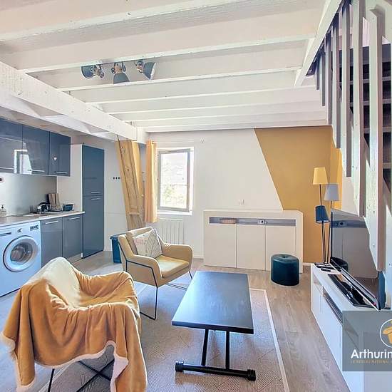 Pontpoint – Appartement meublé 36 m² CARREZ (environ 52 m² au sol) en duplex avec parking À louer, au 1er et dernier étage d’une petite copropriété calme, appartement meublé en excellent état de 36 m² habitables. Il se compose : * Séjour lumineux avec cuisine ouverte équipée : four, plaques, hotte, lave-linge, micro-ondes, réfrigérateur, télévision, table basse, meuble TV, buffet, chaises, fauteuils, lampadaires, tabouret, tapis * Salle d’eau moderne avec douche, meuble vasque, miroir, WC, sèche-serviettes électrique * Chambre à l’étage avec...