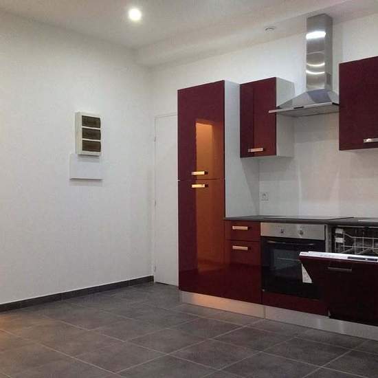 Jolie T2 à Reims situé rue Émile Zola avec une cuisine équipée une terrasse, une chambre, salle de bain et toilettes séparés.