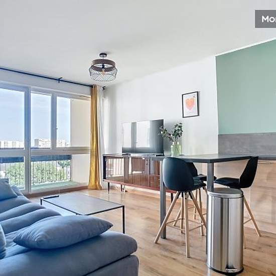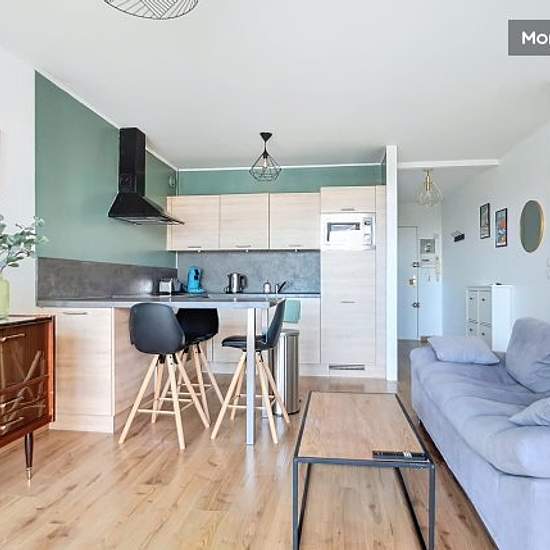 Fully renovated 2-room apartment with uninterrupted views, large terrace, quiet and bright. Office, fibre, fitted kitchen, dressing room. Secure residence with concierge, parking and bike storage. Night space with study area Separate bedroom with double bed (140x190) and new bedding. Roller shutter and blackout curtains. Work area with desk for laptop and chair. Living room Bright living room opening onto a large terrace with uninterrupted views. Sofa, coffee table, TV unit. Fibre optics. Kitchen Open-plan kitchen, fully equipped: oven, indu...