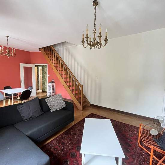 Private bedroom No. 1 of 10 m² in a T4 duplex apartment: (a trundle bed with 3-drawer storage, a desk with storage, a bedside table, a metal wardrobe, a tall cabinet). Access to the apartment's common areas: a kitchen (upper and lower cabinets, extractor hood, oven, fridge/freezer, washing machine connection, ceramic hob + 2 gas burners, a microwave, a central island), a living room (a sofa, an armchair, a coffee table, a shelving unit with drawers, a table, 4 chairs), a bathroom (double sink, 2 storage columns & drawers, a bathtub, a tall c...