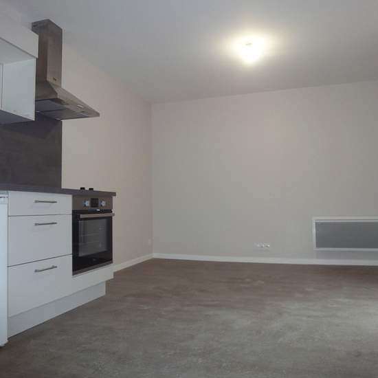 RODEZ : T1 Bis duplex, déco contemporaine comprenant au : RC : une cuisine équipée (placards hauts et bas, hotte aspirante, four à pyrolyse, plaque de cuisson vitrocéramique, frigidaire) ouverte sur le séjour exposé Ouest, salle d'eau aménagée (douche à l'italienne, meuble vasque), WC indépendant, dégagement avec un placard, Étage : une chambre avec un placard, un bureau Chauffage individuel électrique