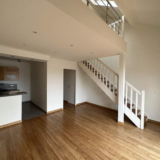 Entrée, Séjour, Cuisine ouverte équipée, wc séparés, Chambre et salle de bains à l'étage. Box. Libre le 3 février 2026