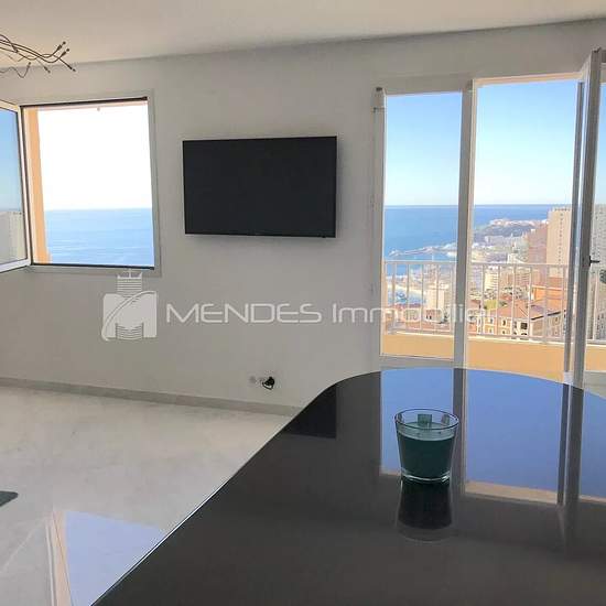 Dans un immeuble situé à proximité de Monaco, sur la commune de Roquebrune cap Martin, se trouve ce très joli 2/3 pièces offrant une vue panoramique mer, montagne et Monaco. Exposition sud. Superficie habitable de 42m2 + terrasse 9m2, au dernier étage, comprenant : séjour avec canapé d'angle et coffre de rangement, table basse et tv, une cuisine américaine entièrement équipée (frigo, congélateur, four, machine à laver et un comptoir bar) ainsi que son accès terrasse avec vue mer, une chambre avec lit double (160cm) et son coffre de rangement...