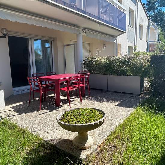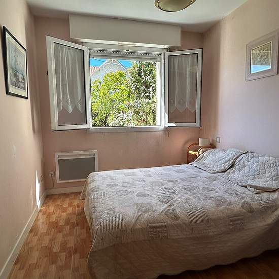 Bel appartement rez-de-chaussée avec terrasse et jardinet. Petite résidence avec piscine collective. Proche plage du bureau (300m) et du centre. Comprenant: 1 chambre lit 140 et chauffeuse 80, salle-d'eau refaite, lave-linge dans placard, WC séparé, séjour (TV + canapé convertible 140) / kitchenette (réfrigérateur-top, lave-vaisselle, micro-ondes, four, plaques vitro-céramique). Surfaces et distances données à titre informatif et non-contractuel Hors saison, juin et septembre: 400E la semaine Du 28/06 au 05/07: 525E la semaine Du 05 au 12/07...