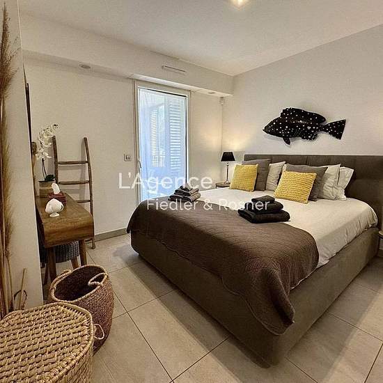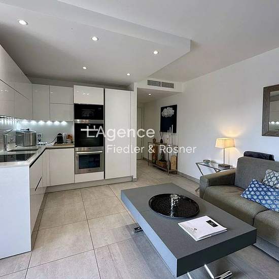 Appartement de 50 m2 - 1 chambre - 1 salle de douche - Terrasse. Appartement situé au sein de la plus luxueuse résidence de Saint-Tropez, à pied de la Place des Lices. Jusqu'à 2 convives. Orientation Sud-Est. Se compose comme suit : entrée desservant un séjour/ cuisine avec canapé d'angle avec méridienne, table basse et écran téléviseur. Une cuisine dotée d'un réfrigérateur, four, four à micro-ondes, plaque de cuisson, machine à glaçons professionnelle, cafetière, grille-pain, cave-à-vin, lave-vaisselle. Toilette invité avec lave-linge. Une ...