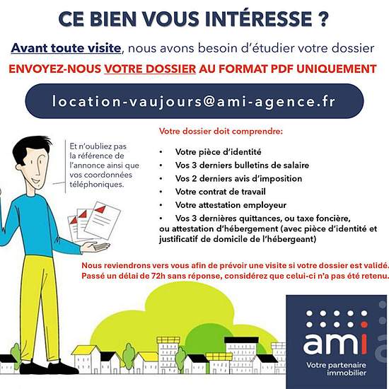 L'agence AMI de Vaujours vous propose à la location un appartement 2 pièces avec balcon, situé à 2min à pied de l'arrêt de bus, 12min de la gare du Vert Galant et à 6min du centre aquatique. Ce bien meublé se compose comme suit: une cuisine équipée et meublée ouvert sur séjour donnant sur un balcon, une chambre et une salle d'eau. Un box fermé complète le bien. La provision pour charges comprend l'eau froide et l'entretien des parties communes. Si ce bien vous intéresse, nous vous invitons à envoyer votre dossier en vous référent à la 2ème i...