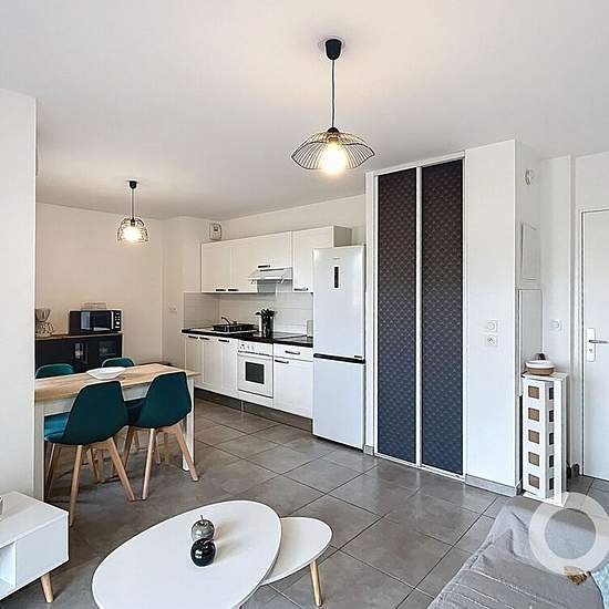 For rent: beautiful furnished T2 at 61 Rue Anatole France, 69100 Villeurbanne. For rent on the 2nd floor with elevator: a superb fully renovated furnished T2 of 39.40 m² at 61 Rue Anatole France in Villeurbanne (69100). The building dates from 2013; the tastefully decorated apartment faces the condominium's interior courtyard and comprises: an entrance with built-in closets, a living room and a fitted and equipped kitchen. The living room opens onto an 11 m² terrace with no overlooking neighbors. The bedroom has large closets and has access ...