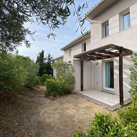 Villa individuelle en duplex comprenant, au rez de chaussée, une entrée, une kitchenette, un coin repas et deux terrasses et jardin A l'étage, Une chambre, une salle de bains et un WC. Un emplacement de parking privatif.