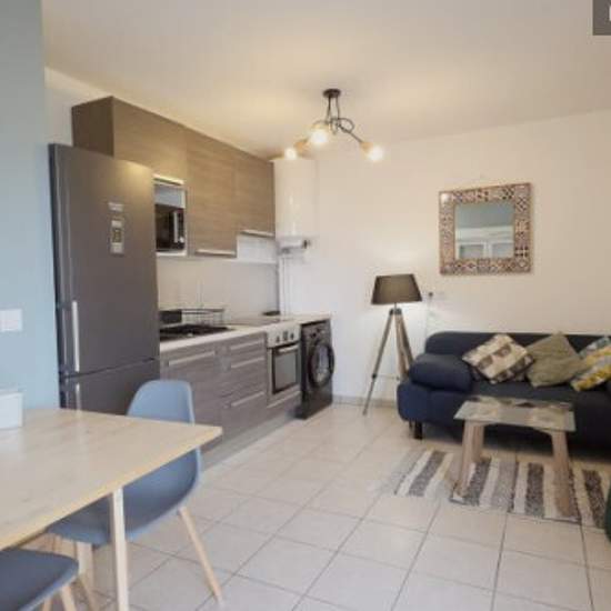 Très agréable logement sans aucun vis-à-vis de 40 m² avec 1 chambre et grande terrasse Situé au cœur du village de Rillieux-La-Pape, proche de nombreux commerces : Banques, Supérette, Pharmacie, Tabac, Boulangerie, Boucherie, Fleuriste etc….. Au premier étage d'un immeuble récent (2012) , sécurisé par interphone et visiophone Stationnement très facile et gratuit autour de l'immeuble Entrée avec porte manteau, banc, meuble à chaussures Salon lumineux avec canapé-lit, table basse, fauteuil, pouf, TV (connexion Internet Fibre optique) Cuisine a...