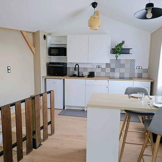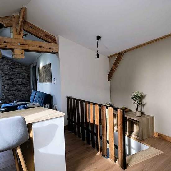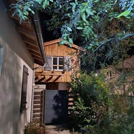 Independent cottage for rent by January 10 — finishing work in progress. Ground floor: large entryway — large bathroom/laundry room. Upper floor: 25 m² living area with a fitted open kitchen and a high table; sleeping area of 6 m². The accommodation is furnished. A 15 m² terrace to be completed before spring, made of wood with privacy screening. Available to reserve now. Furnished rental: two months' security deposit (excluding charges). Charges: water €20 per month. Electricity: monthly reading of the individual sub‑meter. Upper floor heati...