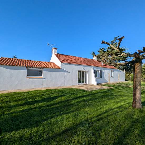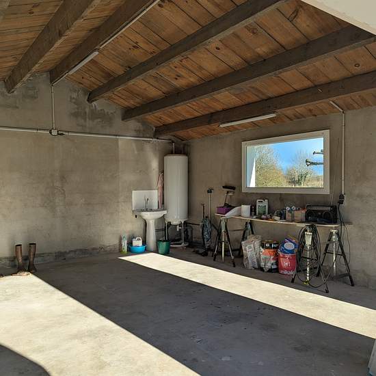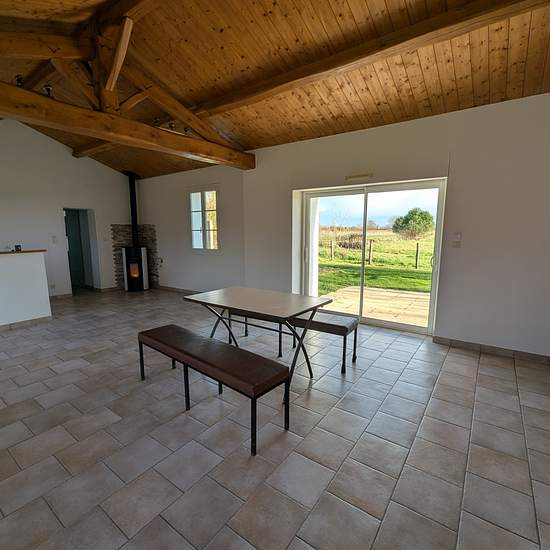 Maison rénovée de type 3 avec garage , composée d'une grande pièce de vie avec coin cuisine ( 45m2) , dégagement, deux chambres , petite salle d'eau , wc chauffage au sol électrique en partie et poele à granules dans le séjour cuisine et radiateurs électriques dans les chambres . un garage Passage commun avec propriétaire