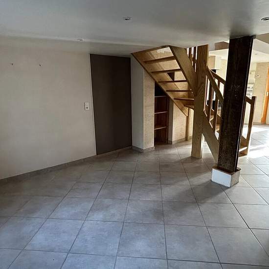 A louer 590€/mois C.C. Maison comprenant une entrée sur véranda de 2,43m², une pièce de vie de 26,67m² avec cuisine aménagée, équipée et poêle à pellets, véranda carrelée de 5,12m² ; A l'étage : palier de 4,90m², une chambre de 13,73m², une salle d'eau de 4,14m² avec sèche serviettes et WC, un bureau parqueté de 8,77m². Double vitrage PVC, volets roulants manuels, terrasse, dépendances, cave. Jardin de 422m²
