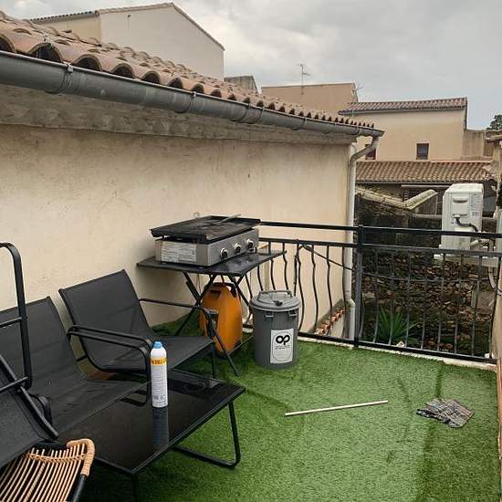 Vauvert, sis 63 rue des Juifs, maison de village de type 2 bis meublé comprenant au rdc, une grande entrée desservant une chambre et la salle de bain. À l'étage, un séjour, une cuisine ouverte, avec climatisation. Au deuxième étage, mezzanine avec climatisation donnant sur un toit terrasse. Loyer 750€ Disponible au 06 / 12 / 25.