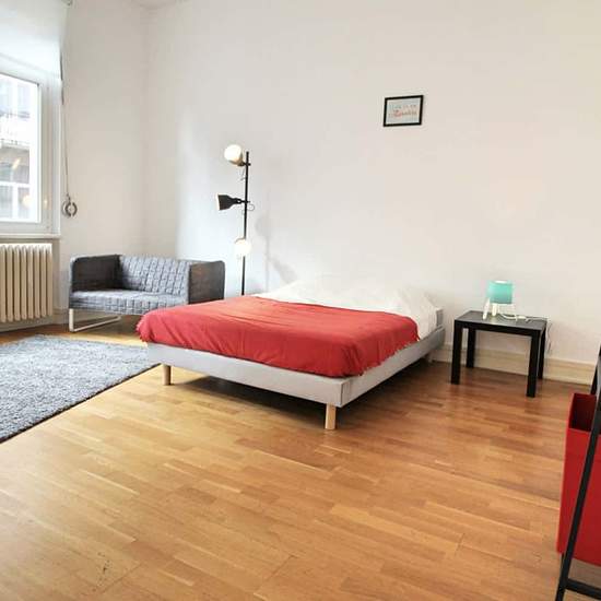 [FR] Très grande chambre de 22m², entièrement meublée. Elle dispose d’un lit double (140x190) accompagné d'une table de chevet avec lampe et d'un grand miroir en tête de lit. Un espace de travail est disponible, composé d'un bureau avec chaise et lampe. La chambre propose également plusieurs rangements : une armoire avec penderie et une étagère. La chambre dispose également d'un canapé. Situé dans le quartier Forêt Noire, cet appartement de 110m² bénéficie d’un emplacement idéal, à deux pas du Jardin Botanique de l’Université de Strasbourg e...